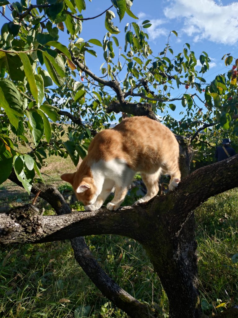• 柿の収穫作業中、猫も木登り